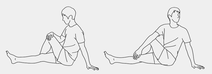 ③右ひざを左のひじで押さえて、上半身を後ろにゆっくりひねります