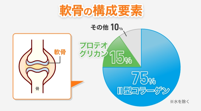 軟骨の構成成分は約75%がⅡ型コラーゲン、約15%がプロテオグリカン、残りの約10%がその他で構成されています。(※水を除く)
