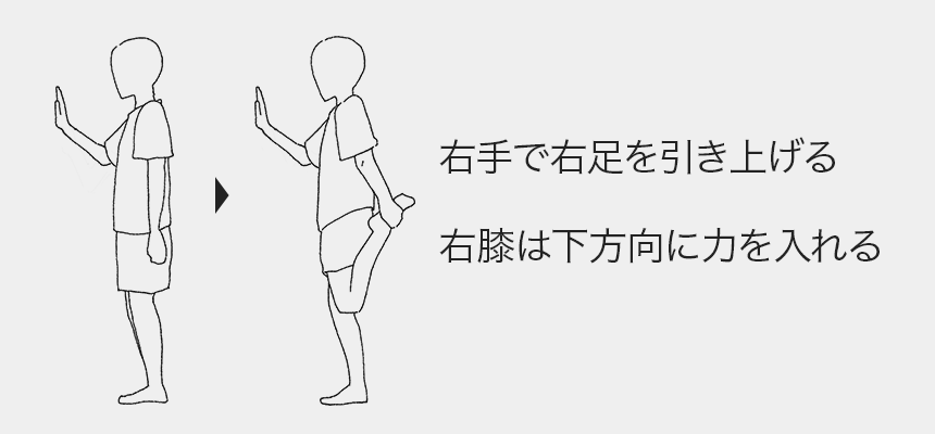 ②右脚のひざを曲げ、つま先をつかみます